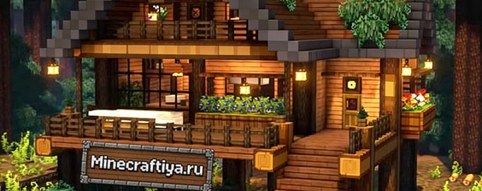 Двухэтажный лесной коттедж для выживания в Minecraft построен на сваях, благодаря чему немного повышается защита от монстров. Внутри просторные и уютные