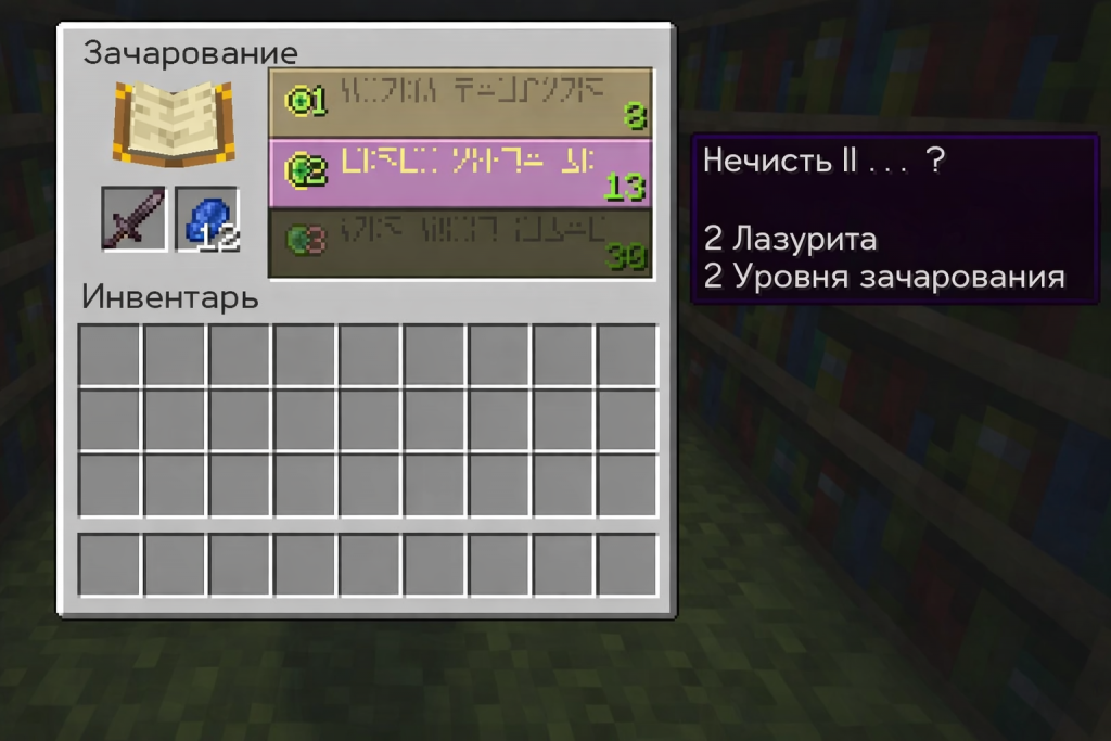 Открыв Стол зачарований, предмет который вы хотите зачаровать, можно поместить в левый слот. Некоторое количество лазурита (который можно добыть) нужно будет поместить в соседнее пространство. Обычно пяти или около того достаточно.