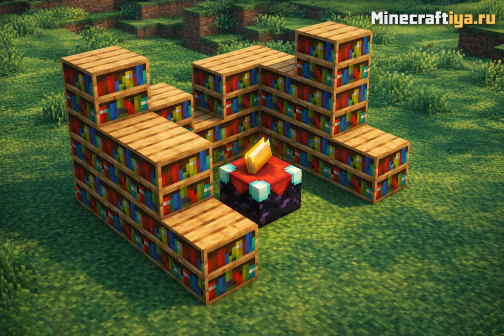 Расположение книжных полок может быть любым, как вам угодно. Важно лишь то, чтобы их было 15 вокруг Стола зачарований и был одноблочный промежуток с пустотой между ними. Выше представлено изображение, демонстрирующее некоторые популярные и эффективные варианты расположения для Стола зачарований.