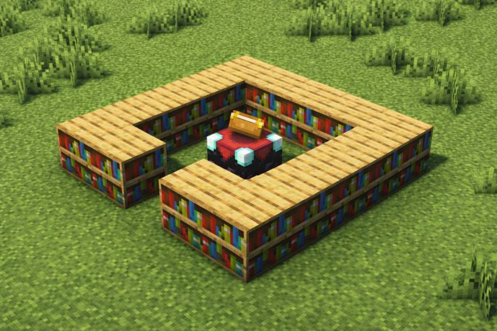 Если установлен только Стол зачарований, уровни чар, которые вы можете получить, будут низкими. Чтобы увеличить уровни, книжные полки должны быть размещены вокруг Стола зачарований, с зазором в 1 блок воздуха между ними.