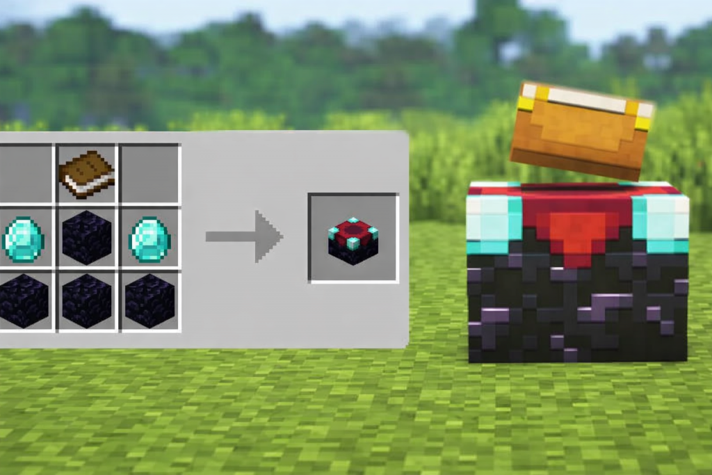 Для создания Стола зачарований в Minecraft вам потребуются 4 обсидиана, 2 алмаза и 1 книга. Обсидиан легко получить из Разрушенных порталов, не ища лавовое озеро, а книги можно создать из 3 единиц бумаги и 1 кожи.
