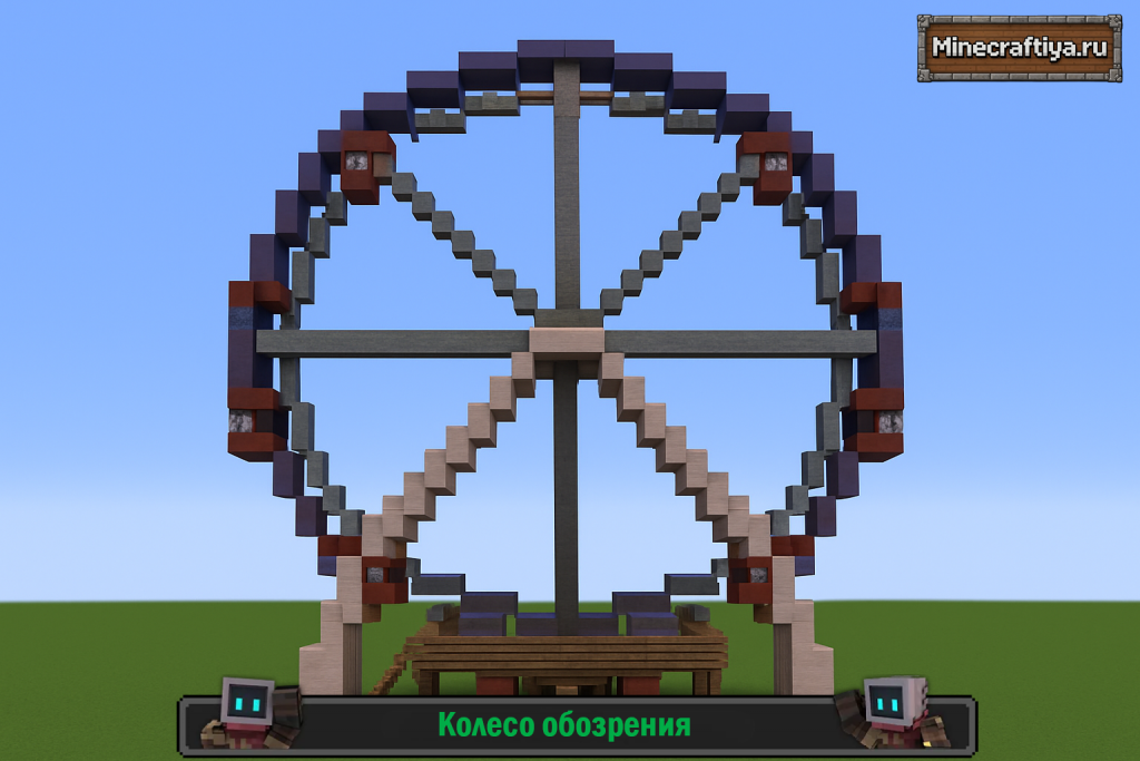 Это колесо обозрения здесь синее с красными кабинками, там можно сидеть и наслаждаться видом. Вы могли бы даже построить это колесо за своим домом в Minecraft — твою личную игровую площадку на заднем дворе — разве это не было бы потрясающе?
