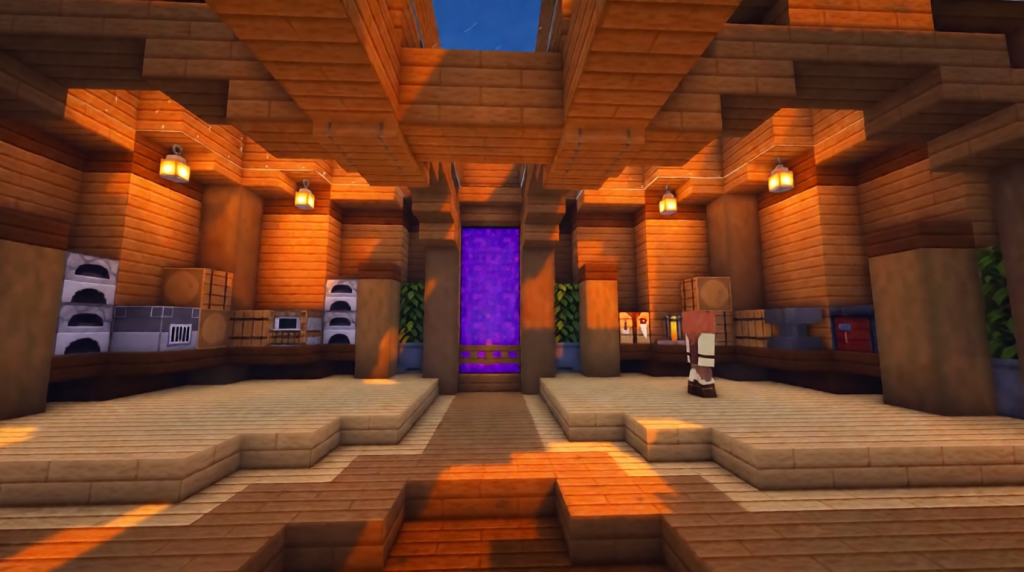 Этот небольшой подземный дом предназначен для выживания в Minecraft. Внутреннее пространство разделено на функциональные зоны: спальню, склад, мастерскую для крафта, участок для переплавки руды и уголок для зачарования предметов.