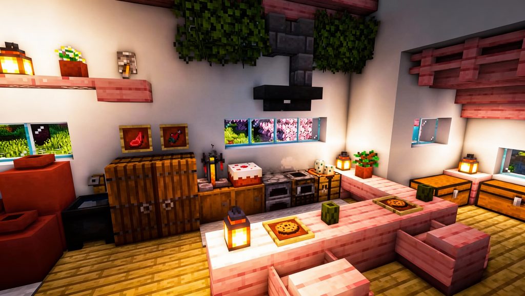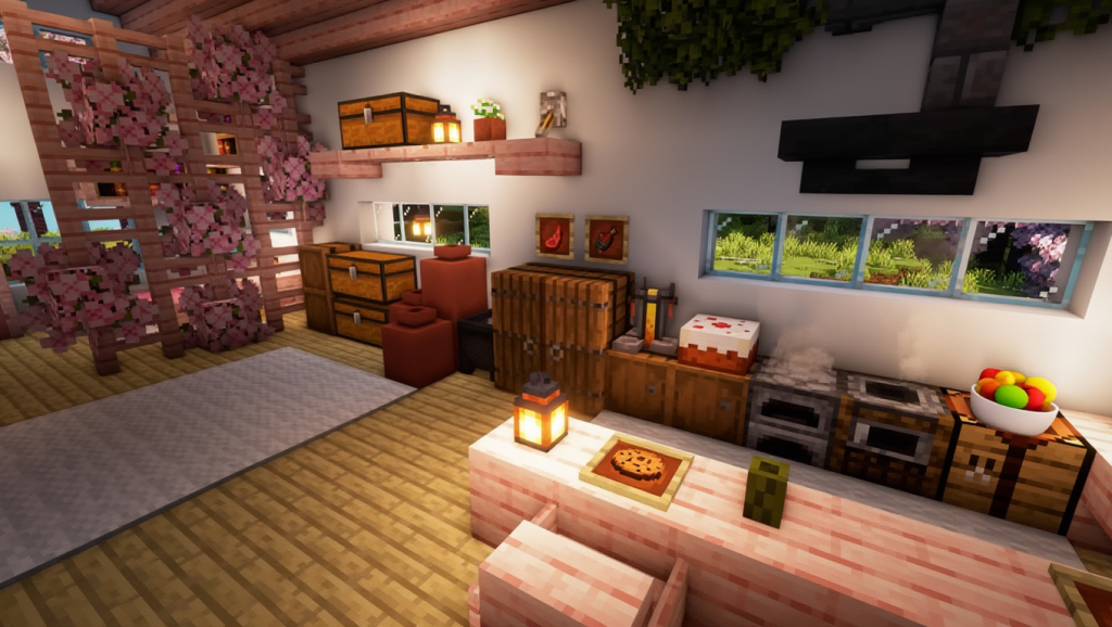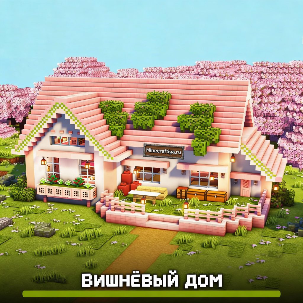 Этот вишнёвый дом выглядит элегантно и аккуратно. Здание достаточно большое, фасад украшен разнообразными декоративными элементами, что придаёт ему уникальность. Внутри находится просторноe помещение, куда легко поместится всё необходимое для комфортного выживания.