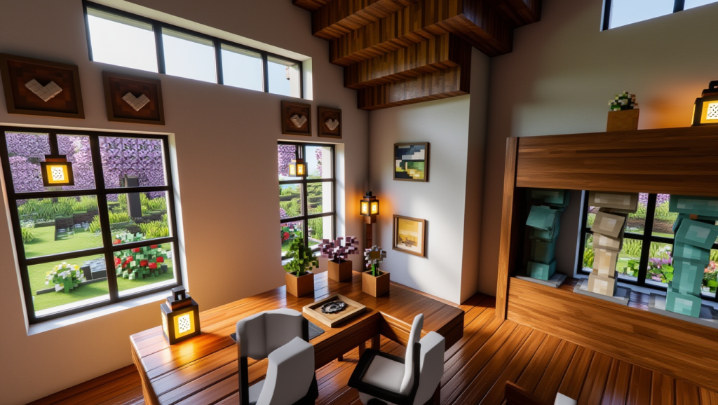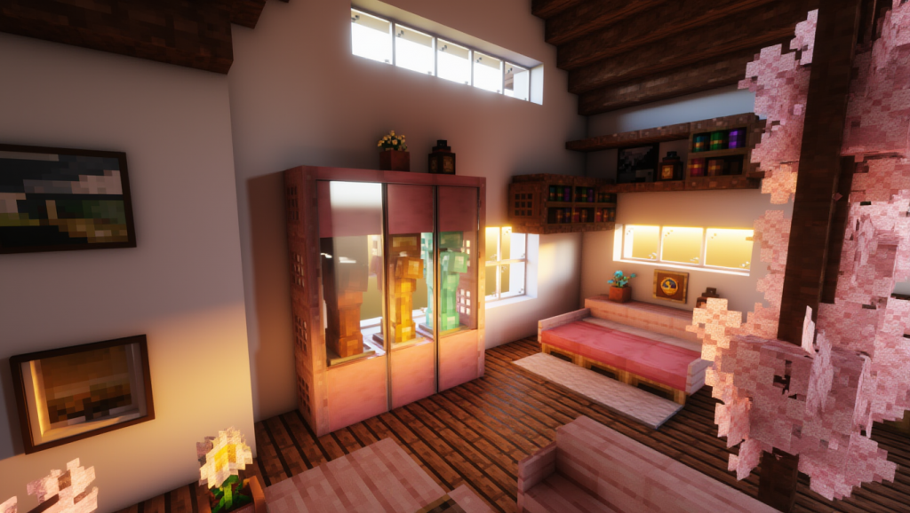 | Вишнёвые доски — 57 шт. Вишнёвые ступеньки — 401 шт. Вишнёвая плита — 67 шт. Вишнёвый люк — 12 шт. Вишнёвый забор — 26 шт. Вишнёвая дверь — 1 шт. Берёзовые доски — 221 шт. Берёзовый забор — 3 шт. Берёзовые ступеньки — 3 шт. | Берёзовая табличка — 2 шт. Белый бетон — 448 шт. Блок мха — 87 шт. Белая керамика — 48 шт. Стеклянная панель — 62 шт. Сундук — 4 шт. Верстак — 1 шт. Белый ковёр — 3 шт. Фонарь — 15 шт. |